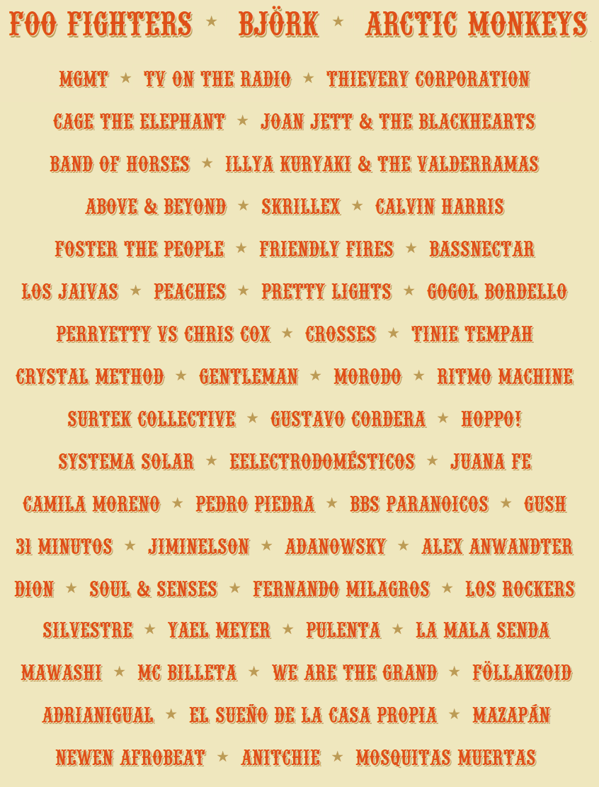 e provavelmente Brasil, tirando-se as bandas locais chilenas e trocando pelas brasileiras (menos o Lobão, que disse que foi convidado e recusou...rs) e adicionando Jane's Addiction e talvez alguma outra banda (o Lúcio Ribeiro coloca o Yeah Yeah Yeahs no bolo ainda).